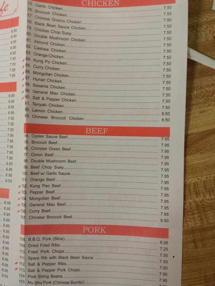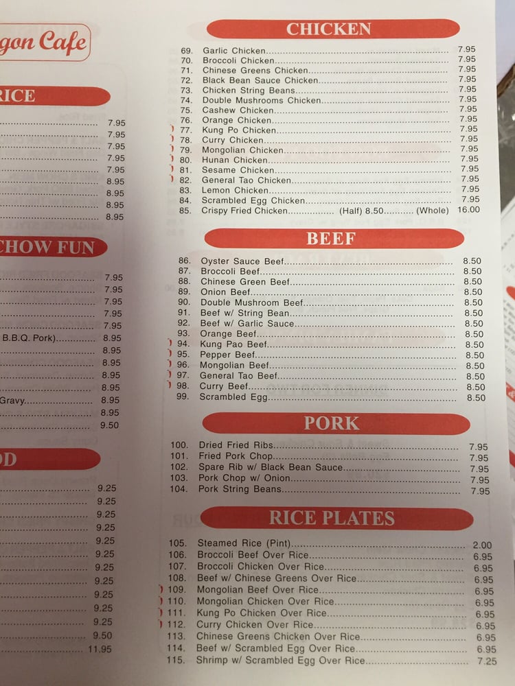 Chicken Chow Mein, Shrimp Fried Rice, Sweet & Sour Chicken, Chicken Wings, Beef w/ Broccoli, Dry Fried Ribs